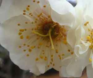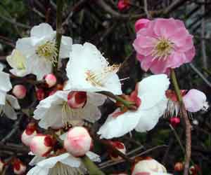 左の梅は「雲竜梅」 枝振りが雲に向かって上っていく竜のようだと。 右の梅は「思いのまま」 なんだか思わせぶりな名前ですが、今咲いてている白とピンクの花が、来年も同じところには咲かないよ、思いのままにはならないんだ、とか。 |