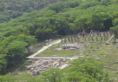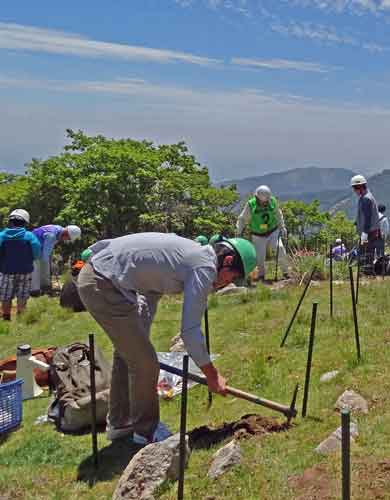 ここはかつてカモシカセンターだった場所です。鹿の害を防ぐために苗木にフェンスを張ります。随分と鹿が増え、カモシカが山の下の方へ追いやられているそうです。食べられないですくすくと育ってほしいものです。