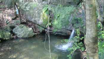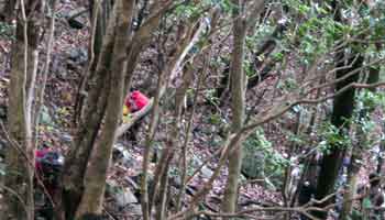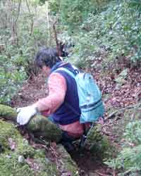 急勾配の道沿いに炭焼き釜の後が残っていました。 こんなに険しい山道では出来上がった炭を 山のふもとまで運ぶのも大変だったでしょうに。 昔の人のご苦労が偲ばれます。 すべり岩渡り→飛び石渡り→おべおべの滝→井戸掘りの滝→崩れ谷→山椒魚谷と、 マア各所に色々な名前が付いているものですね・・・ なんて感心は後からしました。 その時は四つんばいになって必死に地面にしっかりしがみ付きながらよじ登っていました。 トレッキング用の杖ももって行きましたが役に立ちません。 両手でしっかり木の根っことか大きめのしっかりした岩にしがみつかなければズルズルと滑っていってしまいます。 |
