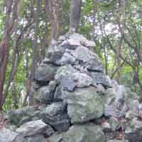 | 少し歩くと山の頂に小石が積み上げられた三角点があります。 神宮領、紀州領、天領の分岐点です。 雑木に囲まれた薄暗い林の中にあり冷たい風が吹き抜けていました。 |