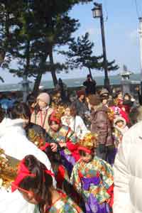 海は強風のため白波が立ち、保護者に手を引かれた稚児行列のお子さんたちも、いかにも寒そうでしたが、無事ゴールの賓日館へ入場していきました。 賓日館は明治20年伊勢神宮に参拝する賓客の休憩、宿泊施設として建設されました。歴代諸皇族方、各界要人が沢山宿泊されたそうです。 明治44年2月隣接する二見館に払い下げられ、二見館別館として平成11年まで貴人の宿泊所とされてきました。 |