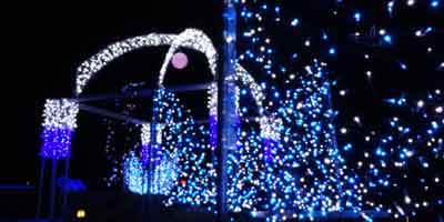 真珠の輝きをモチーフとした「月の雫の光のゲート」「海ほたるをイメージしたオブジェ」「波のオブジェ」などがあり木にもイルミネーションが輝いています。夜の海にマッチしたブルーを基調とした涼しげな光です。
