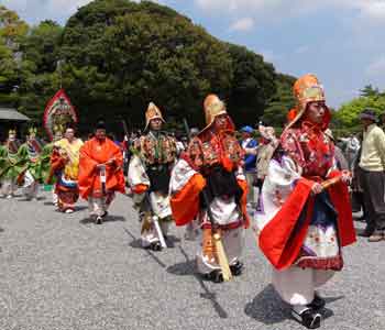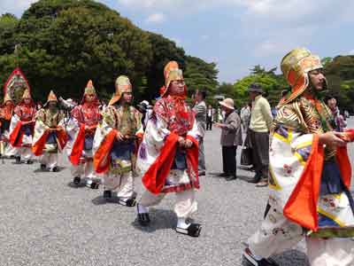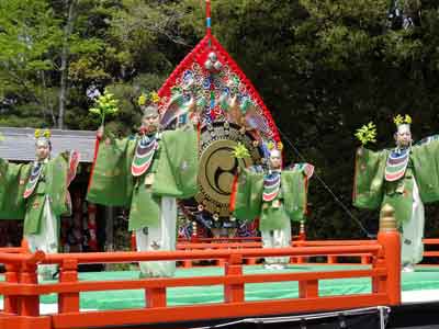 28日(木)内宮神苑特設舞台にて、神宮舞楽が公開されました。 振鉾(えんぶ)、蘇莫者(そまくしゃ)、胡蝶(こちょう)の舞楽に続き、雅楽長慶子(ちょうげいし)が奏されました。