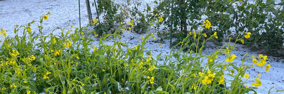 朝熊のこなが黄色の花を咲かせています。さやえんどうも赤紫の花をつけて積雪の冷たさに耐えています。