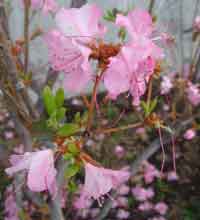 | エゾムラサキつつじが満開です。 道路の両側に不思議な矢印が並んでいます。 雪が積もったときにここが道路の端だと分かるように表示されているそうです。 こんなに雪が積もるなんてすごい。 |