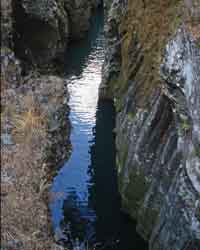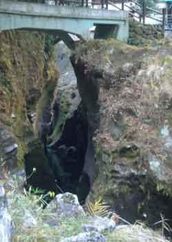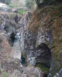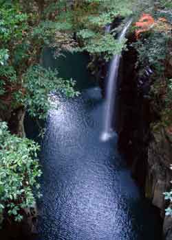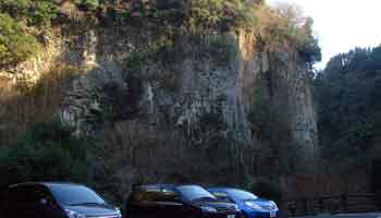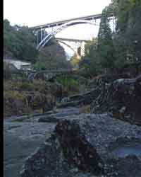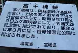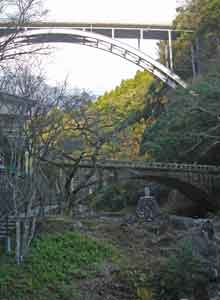 | 阿蘇山系の噴火で流れ出した溶岩が、数万年かけて浸食され生まれた渓谷で、国の名勝天然記念物の高千穂峡。 その高千穂峡へあららぎの茶屋から遊歩道へと続いています。 ポイントがよければ、三つの橋が上へ、上へと重なっているのが見えますがこれは二つだけ。 手前が神橋、上に見えるのが高千穂大橋。ここでは見えませんがその奥に神都高千穂大橋。 山と山を橋でつないでいるような感じです。 |