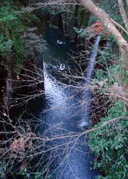 場所を移動すると有名な高千穂峡の写真ポイントです。美しい流れに見とれているとボートが2隻。