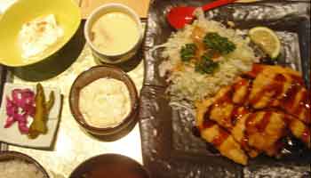 | 目的地を随分削って、走って走ってのドライブ旅行。 ドライバーが一人だったのが気の毒でしたが、知らない道を私が代わる勇気も無く・・・もし代わっていたら同行者は全員車から降りていったことでしょう。 やっと熊本空港に着き、レンタカーを返してから、レストランで夕食をとりました。 大阿蘇鳥南蛮定食です。これも名物。 美味しかったし、ボリュウムタップリ。 |