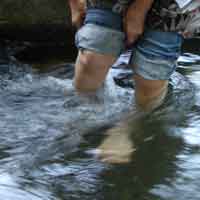 水が勢いよく流れています。 冷たい水で体が引き締まるようです。 童心に帰って水遊び。めったに出来ませんからね、こんな事。 他のグループの方から声が掛かりました。 「気持ちよさそうね〜」 「どうぞ、まだ座れますよ」 時々上流から落ち葉が流れてきますが、あっという間の出来事です。 |