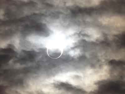 | このあたりが最高潮・・・かな。金環日食の不思議な影を楽しみにしていました。穴の開いたものを色々集めて。 | でもこの雲の所為で、影は全然出来ませんでした。 |