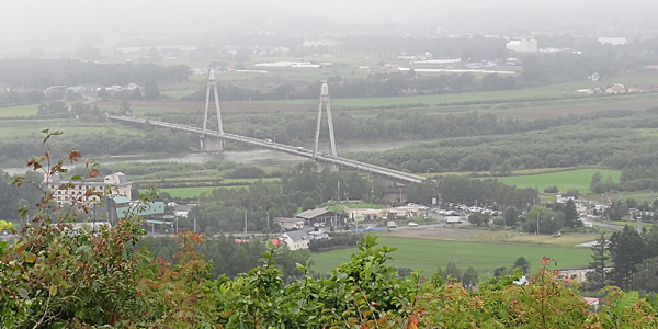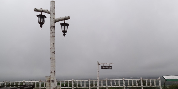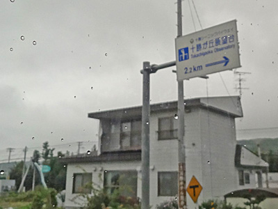北海道らしく遠くに雪対策の表示が見えます。今にも雨が降り出しそうです。十勝が丘展望台の標識が見えてきました。どこまでも続く十勝平野と日高山脈の山並みが美しい撮影スポット。とは言いますが、あいにくの濃霧で眺望は残念ながら・・・。