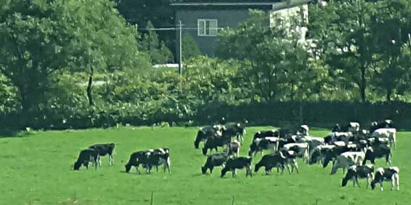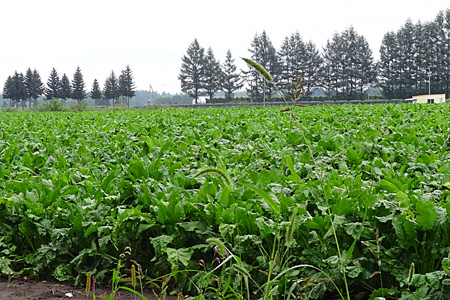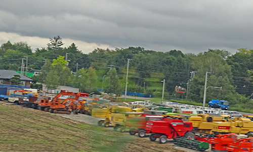 幅広い道路の両脇は今を盛りの豆畑。農機具の展示場かと見まがうほどの多種多様な農機具が並んでいます。