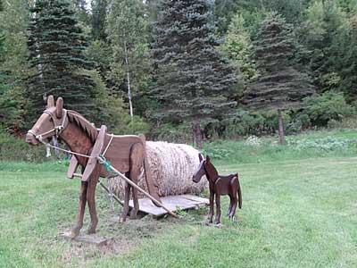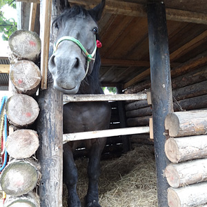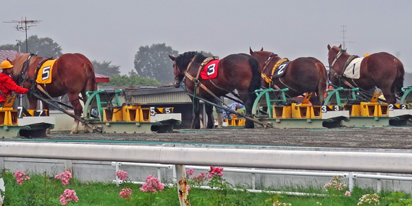 重くてなかなか動けないのを鞭でバチバチ叩きます。その鞭の音が胸に痛く響いてきます。一緒に見ていた幼子は「馬さん可哀想」と涙ぐんでいました。レースを終えた馬は休息、重いそりをつけたままで待機中。荒れた障害の丘を整地しています。