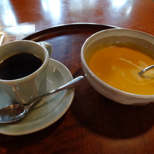 レストランポロシリにたどり着き一休み。コーヒーのチケットを有効に生かして、ついでにポタージュスープも注文。北の大地の野菜はおいしい。店内から見える柏の林が素敵です。