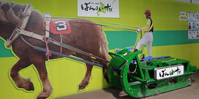 観光バスお決まりのコース、お土産品ゲットに有名な柳月の工場兼売店に立ち寄り、ばんえい競馬場へ。大型の農耕馬に最大1トンの鉄ソリを曳かせ走る北海道ならではのレース。