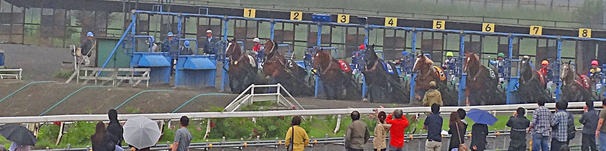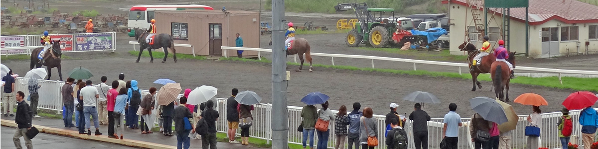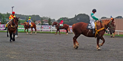 降り出した雨の中、次のレースに出場する馬の顔見世?