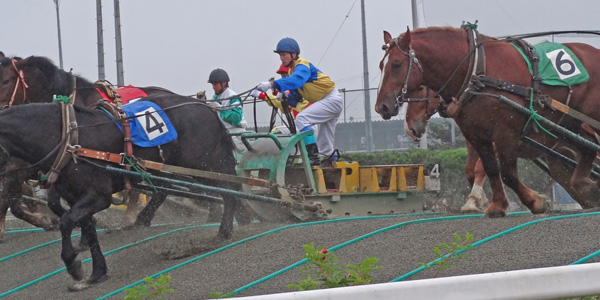 ゲートが開いて雨の中、一斉に疾走・・・じゃあないですね、重いそり付きだからガッ、ガッ、ガッと太い足で歩んでいきます。