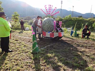 近くの神社では秋祭り。萩の花が咲く今、ばんえい競馬に似せてソリに山盛りの荷物を載せて人間が運ぶ競争に盛り上がっています。