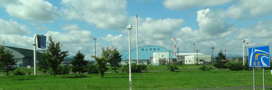 新千歳空港に隣接した海上保安庁の施設。傍に合った不思議な角度の信号機、豪雪地帯ならではの工夫でしょうか?