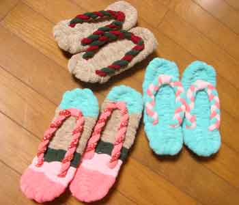 ![]() 36 布端はそれぞれに短く切り、割り箸を使って編みこんだ処へ押し込む。鼻緒は緩んできたときに結びなおせるようにこのまま。できあがり!!!昔のわらぞうりとは作り方が違いますが、初心者の私には形だけでもぞうりになっているのが嬉しい。 |