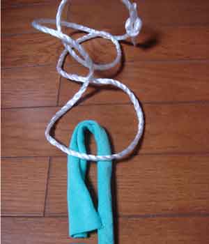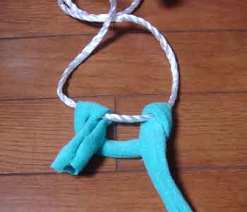 ![]() 8 ひも状の布を結び目ロープの下へ伸ばす |