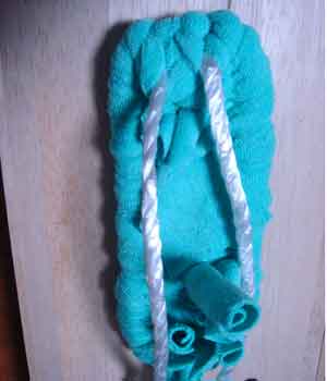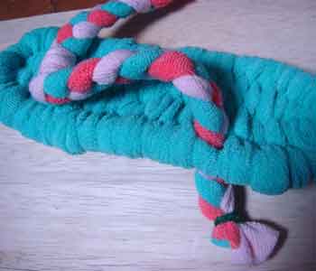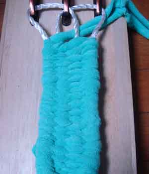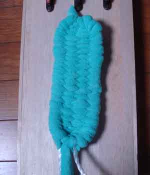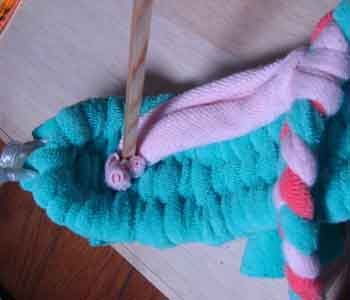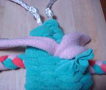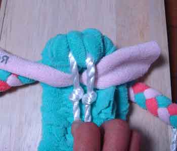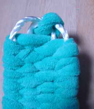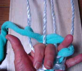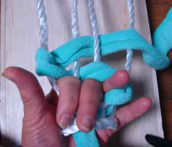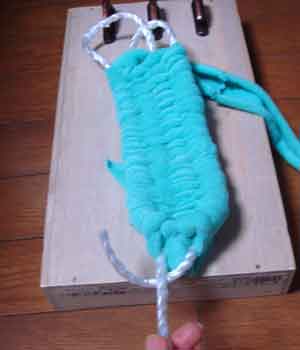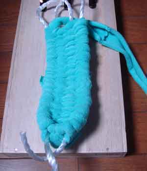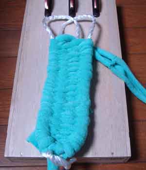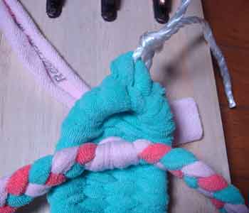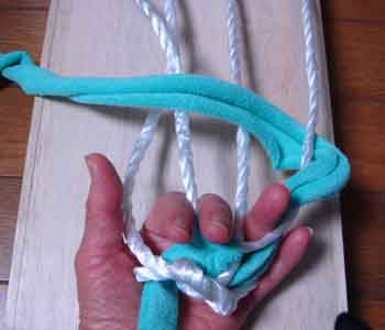 ![]() 3 土台を編むための布(7cm幅)を ロープに結びつける |