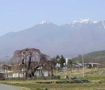 南アルプスをバックにオオイトザクラの大木が一本、田園の中で悠然とそびえていました。