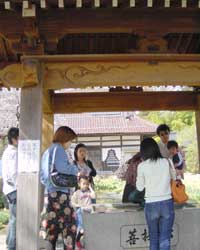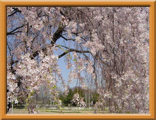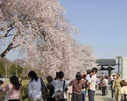| 実相寺山門からは満開の枝垂れさくらが見えます。 | ソメイヨシノと枝垂れさくらの競演 | 山門付近の枝垂れさくら、順番待ちで記念撮影です。 |