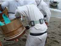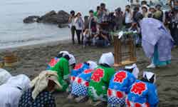 7月11日 鳥羽市菅島町で しろんご祭りが行なわれました 市営定期船で約20分の所にあります。 毎年、海女の潜り初めの神事として、 同日に行なわれます。 この日、雌雄つがいの鮑を 最初に採った海女さんは、 1年中海女頭として尊敬されます。 |