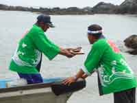腰にはおもりをつけて。 そうしないとスエットスーツを着込んでいるので潜りにくいのだそうです。 |