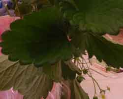 各テーブルにはラッピングされた「かおりの」のイチゴの苗が飾られています。 元気のよい立派な葉っぱや、イチゴの花が活き活きとアピールしています |