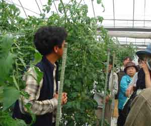午後からはトマトのハウス栽培に取り組んでみえる有竹政史さんの圃場を見学です。