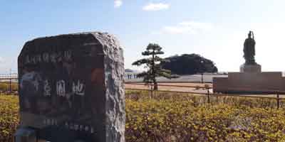 長さ387メートルの橋で陸地と結ばれて、国の天然記念物に指定されている蒲郡のシンボル「竹島」。