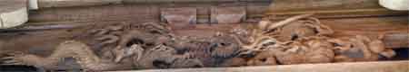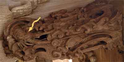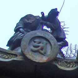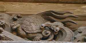 山門は1830年の完成といわれ、的矢の大工棟梁 中村九造が長い年月を掛けて造り上げたそうです。 入母屋造り、本瓦葺、三間一戸の楼門です。 各部には繊細極まりない彫刻が飾られています。この中でイセエビの彫り物は特に素晴らしいと聞き及んで、参詣に訪れた見知らぬ方と一緒に山門の周りを見上げながら、ぐるぐると探し回りました。 ようやく、「アレじゃないか」と声が上がりました。多分そうでしょう、それらしきものが隠れるようにして存在しました。 |