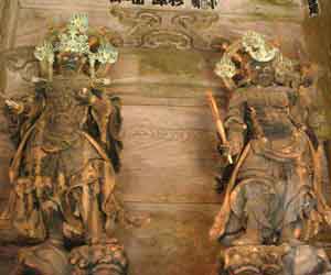 細かい格子に囲まれて、少し影の薄い二王様ですが覗いてみてオヤ!!! 山門の左右で2体ずつ、仁王様が守っておられます。 私、このような仁王様は始めて拝見しました。 |