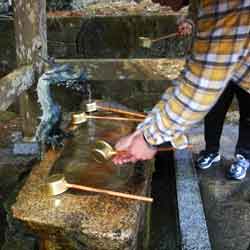 鐘楼では参詣に訪れた方が心を込めて、力強く突き鳴らしています。立ち並ぶ露店を通り抜け、まずは心と手を清めましょう。