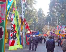 山門をくぐると、又もや沢山の大漁旗のお出迎えです。参道の両側にカラフルで元気いっぱいの旗がなびいています。