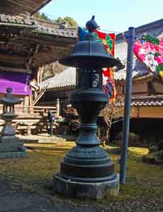 本堂の前でも大漁旗がなびいています。時代を感じさせる灯篭が建っています。一対は青銅かと思われます。柔らかな曲線が美しく、惹きつけられました。石灯篭の台座などでも年代が分かるそうですが、・・・勉強不足です。