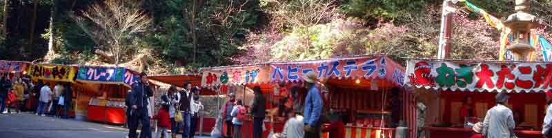 正福寺へと続く道は露店が立ち並び、懐かしい香りを漂わせています。露店の後ろで満開の紅梅、白梅も出る幕無し・・・の感です。