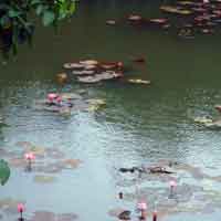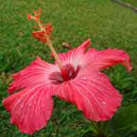 先ほどまで降っていた雨も止んできたので、広い庭園を散策する事に。やしの木には見たことのない実がびっしり。ハイビスカスの花もまだ水滴が乗っています。