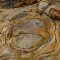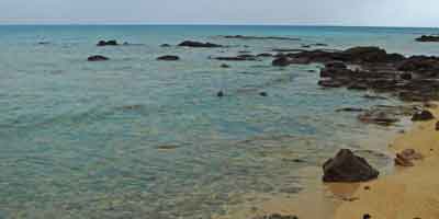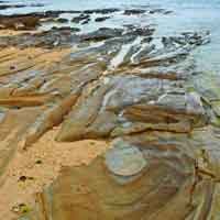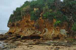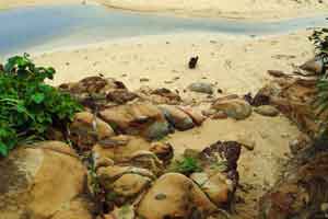 草むらを避けながら海岸へ出ると不思議な地層が現れました。海水による浸食で模様も様々です。サルの顔のように見える岩もあり、砂浜と思いきや珊瑚や貝殻でいっぱいです。