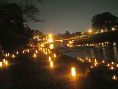 赤福本店横の新橋は、五十鈴川の両岸にセットされたローソクの明かりを楽しむのに絶景の場所です。