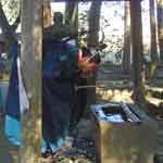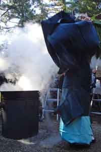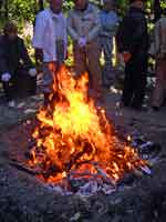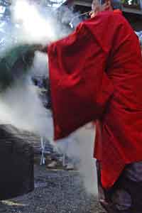 顔に掛かったのはあったか〜いと思える雫です。釜の中はグラグラでも笹で汲み上げて振り回す間に、温度はかなり下がるのでしょうか。始まるまでは火傷したら困るな〜、とか熱で化繊の服は溶けるかも・・・なんて心配をしてました。