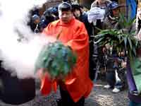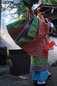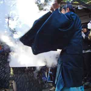神職さんたちは釜の周りを、華麗に舞うようにして笹で熱湯を汲み上げ、集まった氏子たちに降りかけてゆきます。