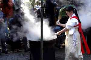 神事のためのお湯が早くも煮えたぎっています。傍では甘酒の振る舞いもあり、有難くいただきました。