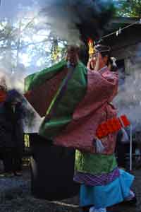 毎年1月14日に行われる湯立て神事。熱湯の飛沫を浴びて心身を清め、今年1年の無病息災を願うという。